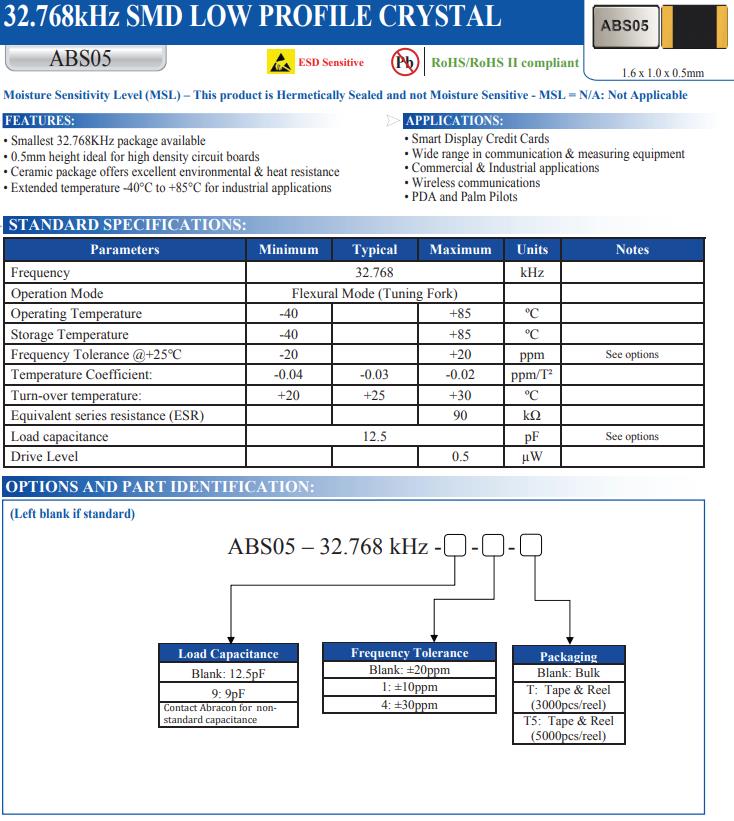 ABS05-32.768KHZ-9-T,1610mm,Abracon品牌,SMD晶體,ABS05,可穿戴設(shè)備晶振,參數(shù)表