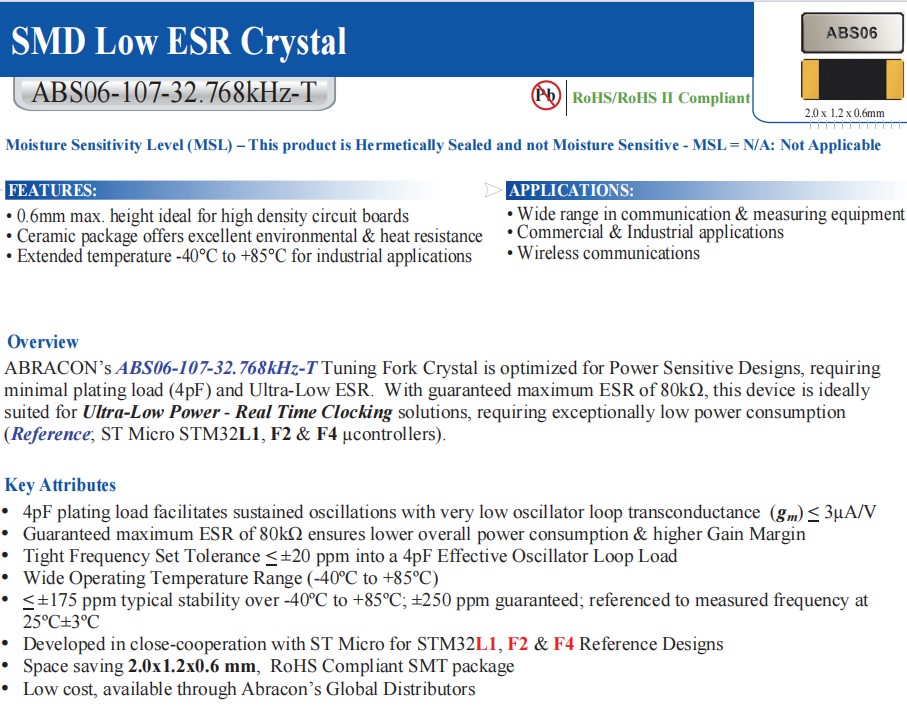 ABS06-107-32.768KHZ-T,2012mm,Abracon實時時鐘晶振,ABS06,兩腳貼片晶振,美國進口晶振,Abracon晶振,艾博康晶振,型號:ABS06系列,編碼為:ABS06-107-32.768KHZ-T,頻率:32.768KHz,小體積晶振尺寸:2.0x1.2x0.6mm,兩腳貼片晶振,無源晶振,石英晶體,時鐘晶振,石英晶體諧振器,ABS06-107-32.768kHz-T調(diào)優(yōu)叉晶體優(yōu)化了功率敏感設(shè)計,需要最小的電鍍負載(4pF)和超低ESR。該設(shè)備保證最大ESR為80kΩ,石英晶振,非常適合超低功耗實時時鐘解決方案,需要異常低的功耗。具有超小型,輕薄型,高品質(zhì),高質(zhì)量,耐熱及耐環(huán)境特點。廣泛使用于:通信設(shè)備,測量設(shè)備,無線通信,商業(yè)和工業(yè)應(yīng)用。