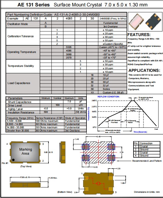 AE-131-A-2-4085-2-30-28M0000,7050mm,Anderson品牌,AE131,微處理器應(yīng)用晶振,產(chǎn)品特點(diǎn):