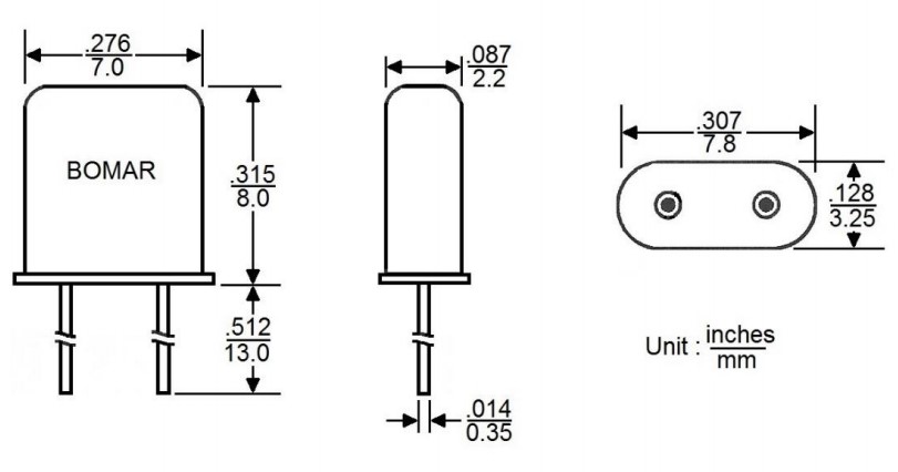 BC21EFD120-26.000000,26MHz,Bomar品牌,穿孔型晶體,UM-1,插件晶振,尺寸圖
