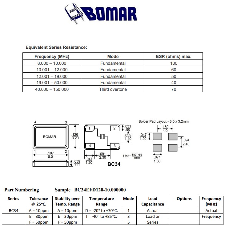 BC34EFI118-24.000000,24MHz,5032mm,Bomar輕薄型晶振,BC34,藍牙應用晶振,美國進口晶振,Bomar博馬爾晶振,型號,BC34,編碼為:BC34EFI118-24.000000,精度:±30ppm,頻率穩定性:±50ppm,工作溫度范圍:-40℃至+85℃,負載電容:18pF,頻率為:24.000MHz,小體積晶振尺寸:5.0x3.2x1.0mm,四腳貼片晶振,石英晶振,5032無源晶振,石英晶體諧振器。BC34系列是一種超薄的SMD型晶體,它的低輪廓允許簡化電路設計。它的陶瓷底座和金屬外殼,為許多應用提供了所需的耐用性和可靠性,包括藍牙、手機、USB接口卡和無線通信應用。