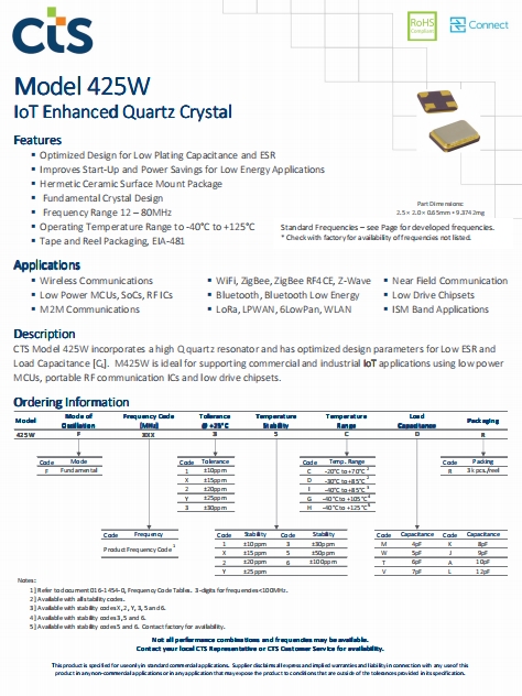 CTS晶振425,425F35B027M0000無源貼片晶振,西迪斯晶振,歐美進(jìn)口晶振,石英晶體,SMD晶振,石英貼片晶振,石英晶體諧振器,型號425,編碼425F35B027M0000是一款金屬面四腳貼片型的音叉晶體,尺寸為2520mm,頻率為20MHZ,產(chǎn)品具備良好的穩(wěn)定性能和耐壓性能.特點優(yōu)化設(shè)計為低電鍍電容和ESR提高啟動和節(jié)能為低能耗應(yīng)用密封陶瓷表面安裝包基本晶體設(shè)計頻率范圍12-80MHz工作溫度范圍到-40°C到+125°C磁帶和卷軸包裝,應(yīng)用程序應(yīng)用無線通信低功耗微片機(jī),SoCs,射頻集成電路M2M通信WiFi,ZigBee,ZigBee RF4CE,Z-Wave藍(lán)牙,藍(lán)牙低能量LoRa,LPWAN,6低Pan,W局域網(wǎng)近場通信低驅(qū)動芯片組ISM頻帶應(yīng)用程序.