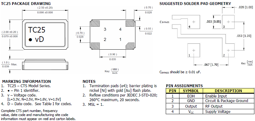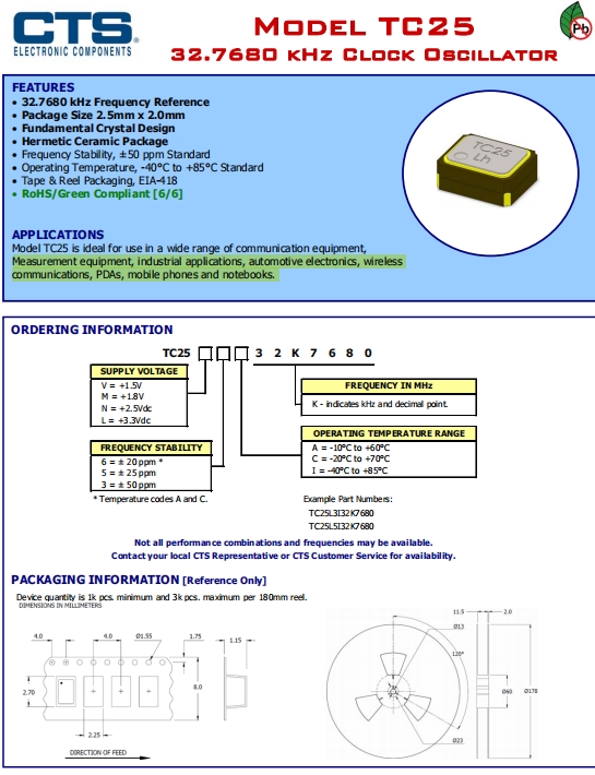 TC25L5C32K7680 | CTS-Frequency Controls | TC25 | 32.768kHz | ±25ppm | 0.098" L x 0.079" W (2.50mm x 2.00mm) | 0.039" (1.00mm) |