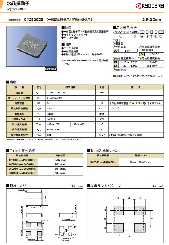 石英晶體諧振器,CX2520DB無源晶振,日本kyocera貼片晶振,2.5 × 2.0mm的貼片晶振,輸出頻率12MHZ~54MHZ,晶體單位消費產品,陶瓷外殼,回流兼容,AEC-Q200合格,應用程序數字電子技術,消費者產品,移動通信、藍牙,無線局域網,汽車電子產品.