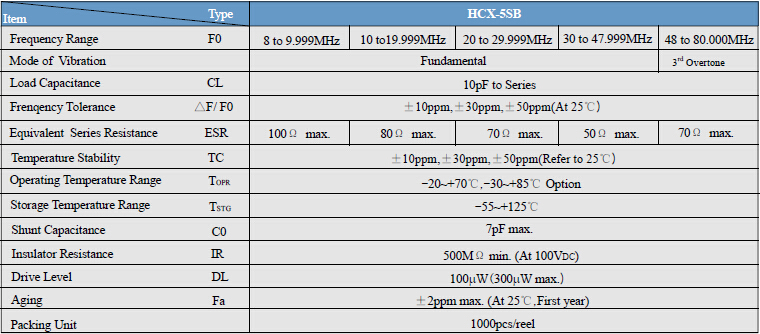5032mm貼片晶振,HCX-5SB,HCX-6SB,HCX-7SB晶振,鴻星石英晶體諧振器,非常緊湊輕薄(5.0 * 3.2 * 0.9mm MAX)頻率范圍8.0MHZ~80.0MHZ.基準的頻率可以滿足大多數藍牙芯片,優良的耐熱性和耐沖擊性,無鉛的產品,這些能滿足使用無鉛焊料回流分析的要求.