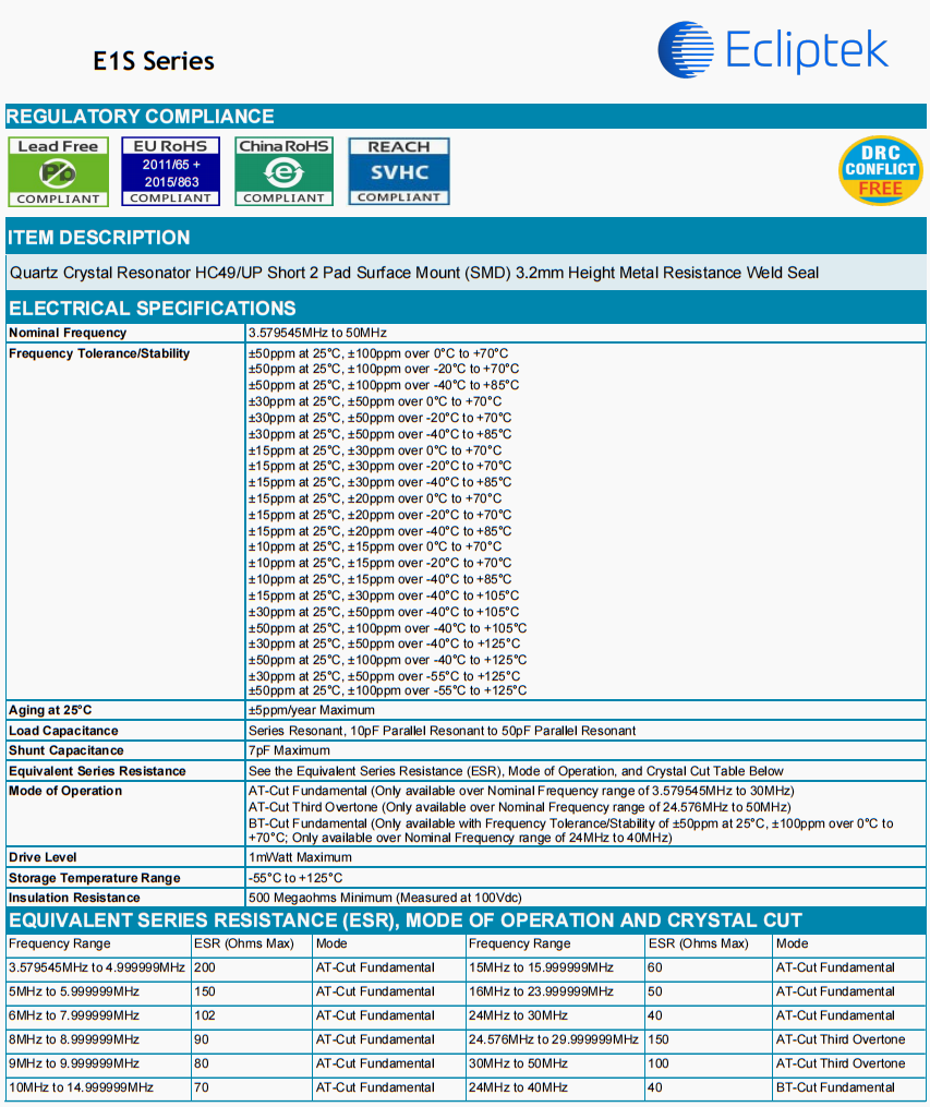 E1SFA18-7.3728M TR | Ecliptek | E1S | -40°C ~ 85°C | 7.3728 MHz | ±50ppm | ±30ppm | 18 pF |
