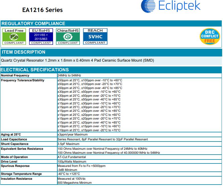 ECLIPTEK日蝕晶振,EA1216貼片諧振器,EA1216NA20-24.000M-TR晶體,貼片晶振本身體積小,超薄型石英晶體振蕩器,特別適用于有目前高速發展的高端電子數碼產品,因為晶振本身小型化需求的市場領域,小型,薄型是對應陶瓷振蕩器(偏差大)和普通的石英晶體振蕩器(偏差小)的中間領域的一種性價比較出色的產品.產品廣泛用于筆記本電腦,無線電話,衛星導航SSD,USB,Blu-ray等用途,符合無鉛焊接的高溫回流焊曲線特性.