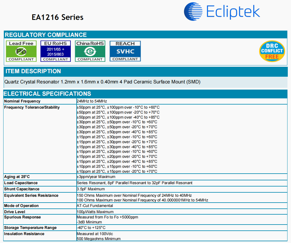 EA1216MA08-25.000M TR | Ecliptek | EA1216 | -40°C ~ 85°C | 25 MHz | ±20ppm | ±15ppm | 8 pF |