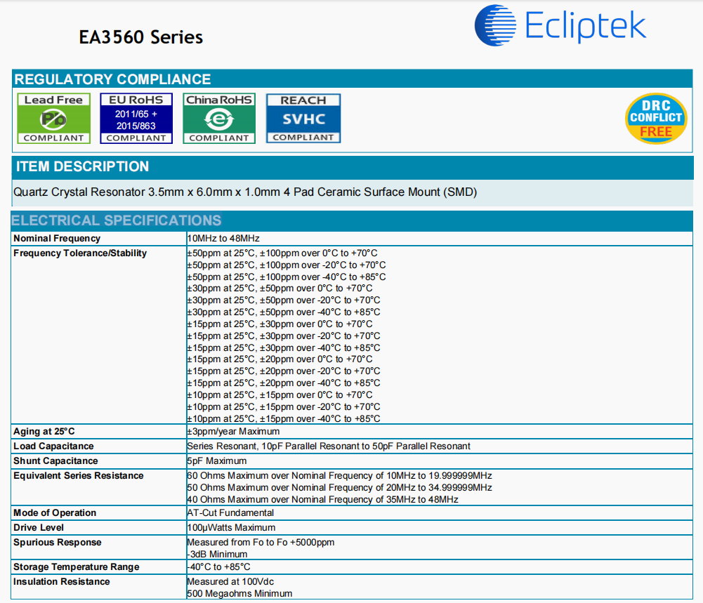 EA5070JA20-14.31818M TR | Ecliptek | EA5070 | -40°C ~ 85°C | 14.31818 MHz | ±30ppm | ±15ppm | 20 pF |