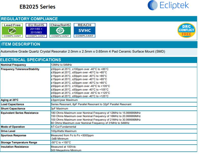 ECLIPTEK諧振器,EB2025小尺寸晶體,EB2025XA20-20.000M-TR晶振,Ecliptek日蝕晶振公司成立于1987年,是一家SMD石英晶體,貼片無源晶振頻率元件控制市場上公認的領導者.日蝕晶振公司擁有先進的產品和領先的技術使我們能夠為客戶提供最好的石英晶體,貼片晶振,石英水晶和有源晶振,石英晶體振蕩器,貼片振蕩器產品.