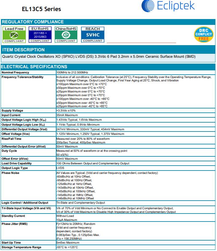 ECLIPTEK進口晶振,EL13C5差分晶振,EL13C5C2F-120.000M-TR晶振,服務(wù)是ECLIPTEK晶振成功的基石.我們時時為客戶著想,盡力滿足并超越客戶對于我們的石英晶振,貼片晶振,電壓晶體元件,晶體振蕩器,有源晶振等產(chǎn)品的質(zhì)量要求以及服務(wù)價值.Nominal Frequency | 100MHz to 212.500MHz |