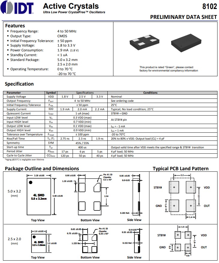 Supply Voltage | VDD | 1.8 V | 2.5 V | 3.3 V | Nominal | |||||||||||||||||||||||||||||||||||||||