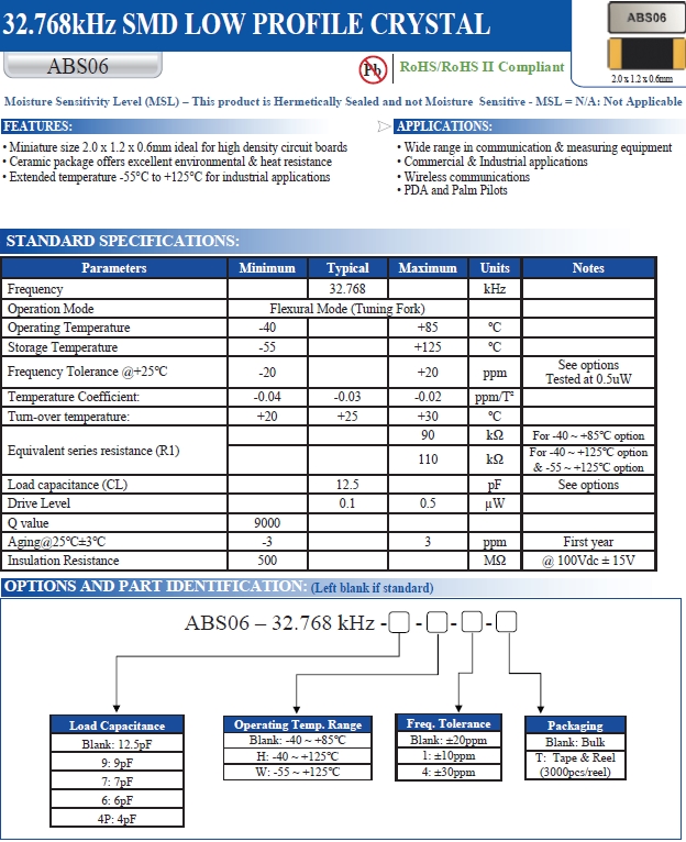Abracon晶振, ABS06-32.768KHZ-9-T,ABS06諧振器.小型貼片石英晶振,外觀尺寸具有薄型表面貼片型石英晶體諧振器,特別適用于有小型化要求的市場領域,比如智能手機,無線藍牙,平板電腦等電子數碼產品.晶振本身小型,薄型,重量輕,晶體具有優良的耐環境特性,如耐熱性,耐沖擊性,