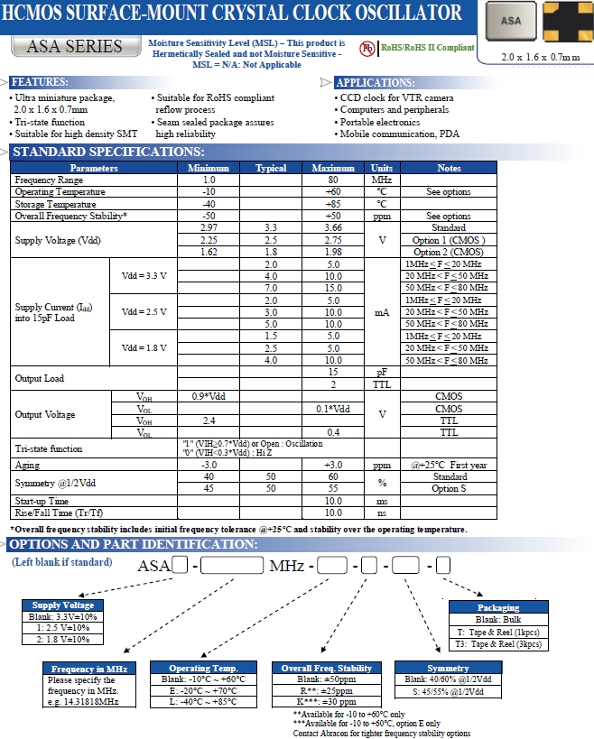 Abracon晶振,ASA-16.000MHZ-L-T振蕩器,ASA石英振蕩器.普通貼片石英晶振外觀使用金屬材料封裝的,具有高穩(wěn)定性,高可靠性的石英晶體振蕩器,晶振外觀本身使用金屬封裝,充分的密封性能,可確保其高可靠性,采用編帶包裝,外包裝采用朔膠盤,可在自動(dòng)貼片機(jī)上對(duì)應(yīng)自動(dòng)貼裝等優(yōu)勢(shì).