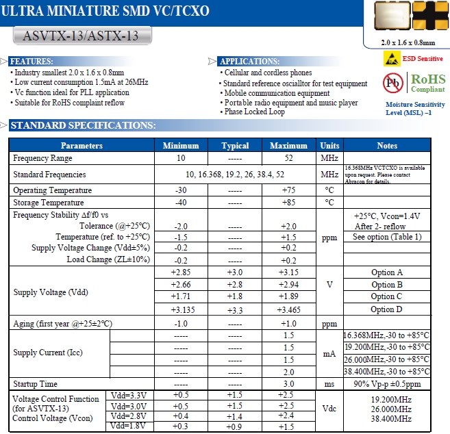 Abracon晶振,有源晶振,ASTX-13貼片晶振.貼片石英晶體,體積小,焊接可采用自動(dòng)貼片系統(tǒng),產(chǎn)品本身小型,表面貼片晶振,特別適用于有小型化要求的電子數(shù)碼產(chǎn)品市場(chǎng)領(lǐng)域,因產(chǎn)品小型,薄型優(yōu)勢(shì),耐環(huán)境特性,包括耐高溫,耐沖擊性等,在移動(dòng)通信領(lǐng)域得到了廣泛的應(yīng)用,晶振產(chǎn)品本身可發(fā)揮優(yōu)良的電氣特性,滿足無(wú)鉛焊接的高溫回流溫度曲線要求.