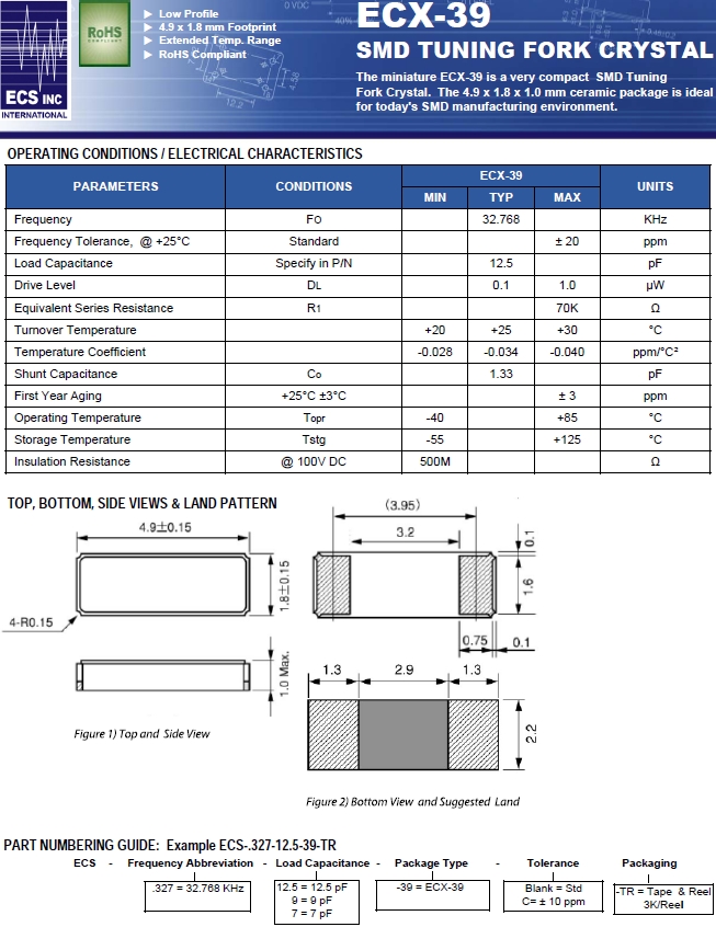 ECS晶振,ECS-.327-12.5-39-TR壓電晶體,ECX-39晶體諧振器.符合無鉛認證,滿足無鉛焊盤的回流溫度曲線要求,金屬外殼的石英晶振使得產品在封裝時能發揮比陶瓷晶振外殼更好的耐沖擊性能.廣泛的應用,晶振產品本身可發揮優良的電氣特性,滿足無鉛焊盤的高溫回流溫度曲線要求.