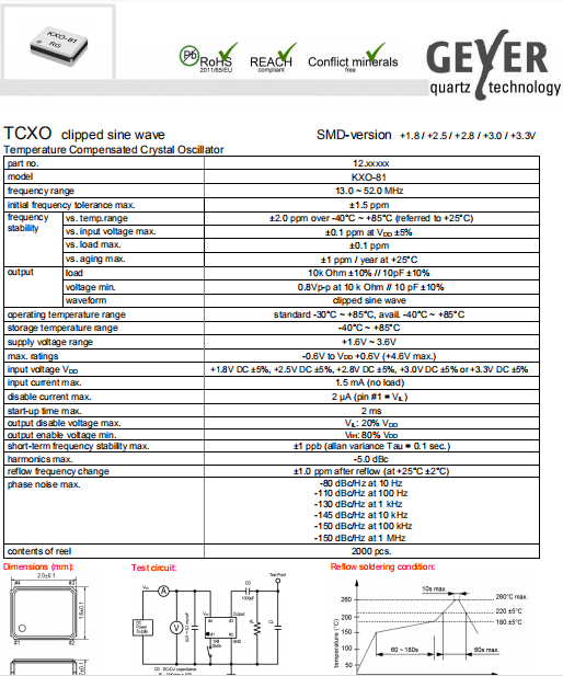 Geyer晶振,KXO-81晶振,有源晶振.小型SMD有源晶振,從最初超大體積到,有著翻天覆地的改變,體積的變小也使產(chǎn)品帶來(lái)了更高的穩(wěn)定性能,接縫密封石英晶體振蕩器,精度高,覆蓋頻率范圍寬的特點(diǎn),SMD高速自動(dòng)安裝和高溫回流焊設(shè)計(jì),Optionable待機(jī)輸出三態(tài)輸出功能,電源電壓范圍:1.8~5 V,高穩(wěn)定性,低抖動(dòng),低功耗,主要應(yīng)用領(lǐng)域:無(wú)線通訊,高端智能手機(jī),平板筆記本W(wǎng)LAN,藍(lán)牙,數(shù)碼相機(jī),DSL和其他IT產(chǎn)品的晶振應(yīng)用,三態(tài)功能,PC和LCDM等高端數(shù)碼領(lǐng)域,符合RoHS/無(wú)鉛.