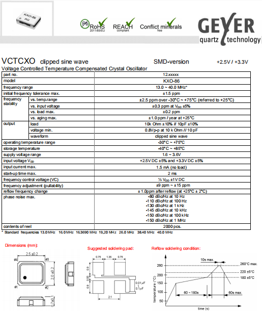 Geyer晶振,KXO-86晶振,壓控溫補(bǔ)晶體振蕩器.2520mm體積的石英晶體振蕩器,有源晶振,該產(chǎn)品可驅(qū)動2.5V的溫補(bǔ)晶振,壓控晶振,VC-TCXO晶體振蕩器產(chǎn)品,電源電壓的低電耗型,編帶包裝方式,可對應(yīng)自動高速貼片機(jī)自動焊接,及IR回流焊接(無鉛對應(yīng)),為無鉛產(chǎn)品,超小型,質(zhì)地輕.產(chǎn)品被廣泛應(yīng)用到集成電路,程控交換系統(tǒng),無線發(fā)射基站.