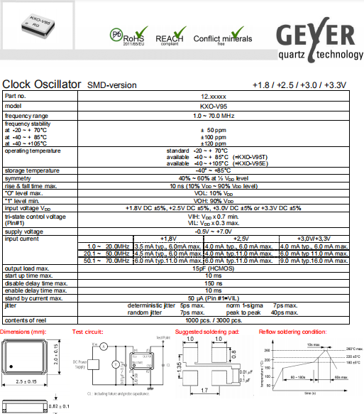 Geyer晶振,KXO-V95晶振,低功耗晶振.有源晶振,是只晶體本身起振需要外部電壓供應,起振后可直接驅動CMOS 集成電路,產品本身已實現與薄型IC(TSSOP封裝,TVSOP封裝)同樣的1mm厚度,斷開時的消費電流是15 µA以下,編帶包裝方式可對應自動搭載及IR回流焊接(無鉛對應)產品有幾種電壓供選1.8V,2.5V,3V3.3V,5V,以應對不同IC產品需要.