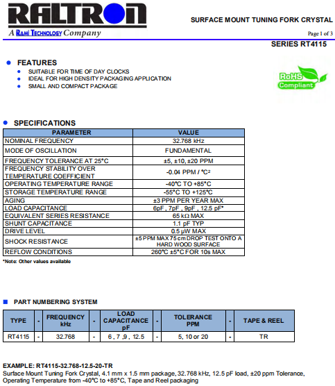 RALTRON晶振,RT4115晶振,高品質石英晶體.小體積SMD時鐘晶體諧振器,是貼片音叉晶體,千赫頻率元件,應用于時鐘模塊,智能手機,全球定位系統,因產品本身體積小,SMD編帶型,可應用于高性能自動貼片焊接,被廣泛應用到各種小巧的便攜式消費電子數碼時間產品,環保性能符合ROHS/無鉛標準.