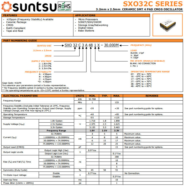 suntsu晶振,SXO32C晶振,石英晶體振蕩器.有源晶振,是只晶體本身起振需要外部電壓供應,起振后可直接驅動CMOS 集成電路,產品本身已實現與薄型IC(TSSOP封裝,TVSOP封裝)同樣的1mm厚度,斷開時的消費電流是15 µA以下,編帶包裝方式可對應自動搭載及IR回流焊接(無鉛對應)產品有幾種電壓供選1.8V,2.5V,3V3.3V,5V,以應對不同IC產品需要.