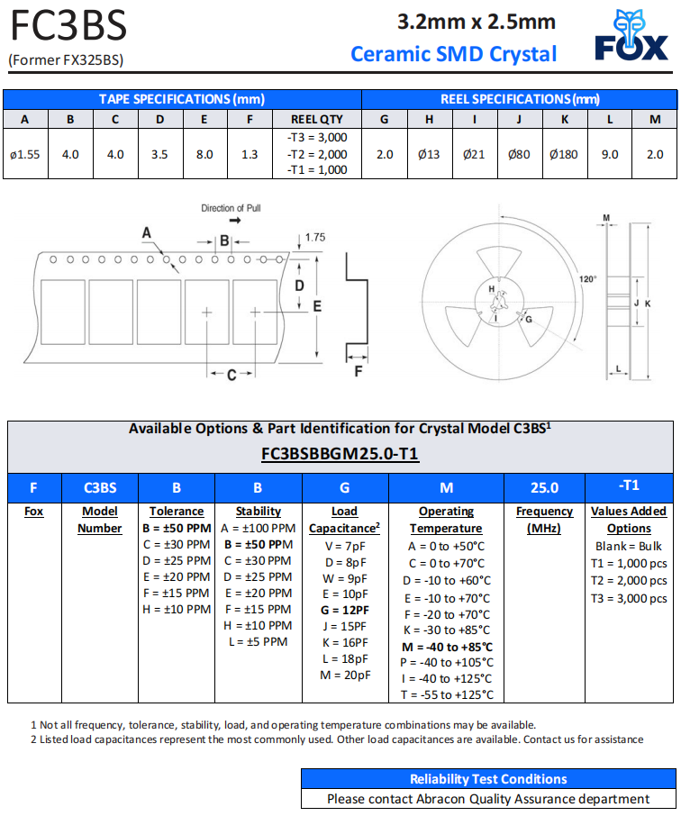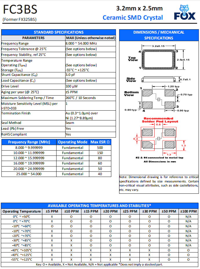 FC3BSBBGM20.0-T1,FOX晶體諧振器,FX325BS石英晶體,6G無線晶振,FC3BSECKP30.0-T1,汽車充電樁晶振,參數(shù)表