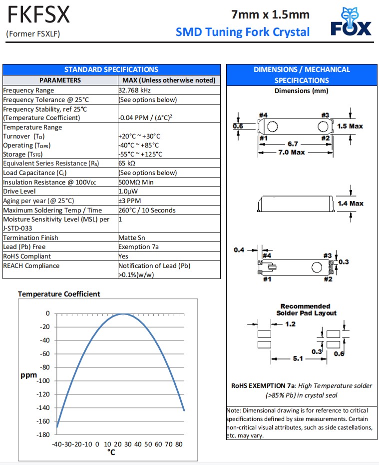 FSXLF327 | Fox福克斯晶振 | FSXLF | 32.768kHz | 4-SMD, Flat Lead, 3 Leads |