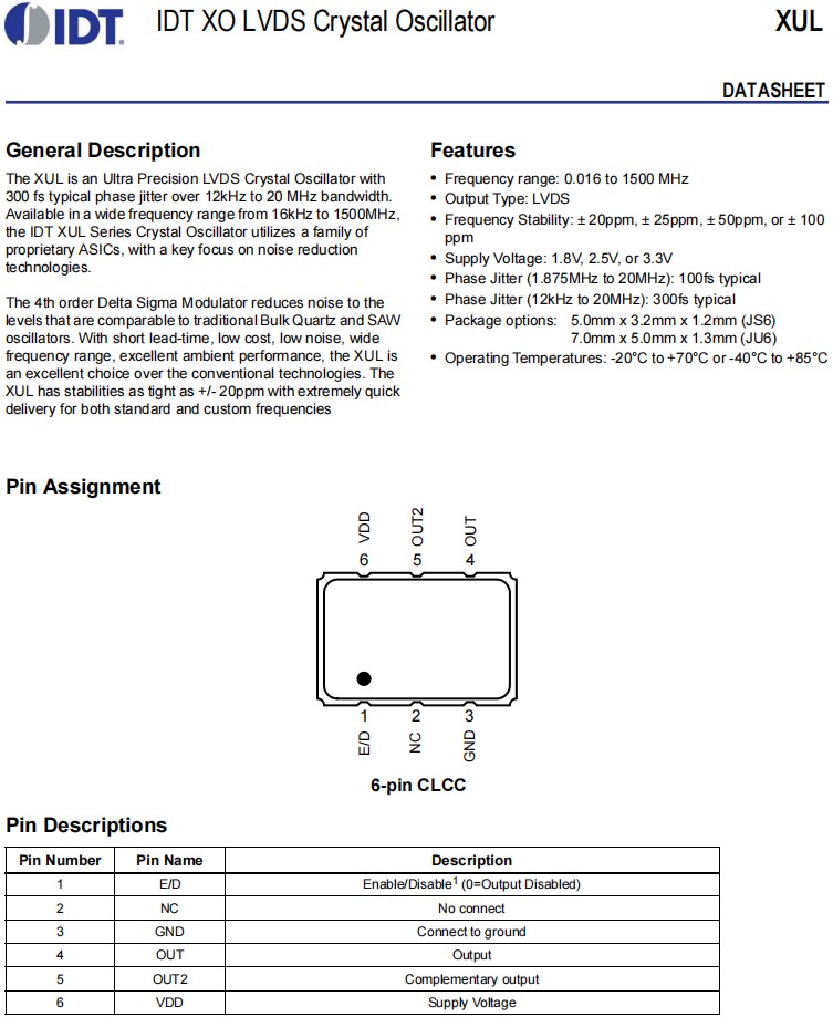 XUL535125.000JS6I8 | IDT晶振 | OSC 125MHZ SMD | XUL | 125MHz | LVDS |