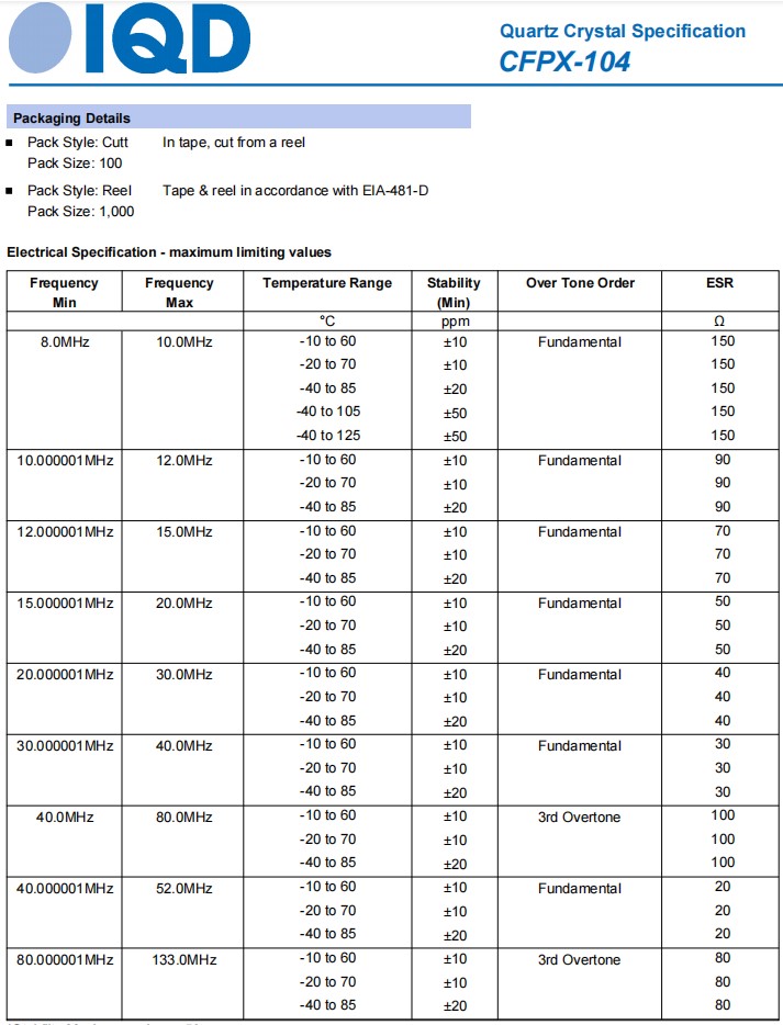 LFXTAL059529BULK | IQD晶振 | CFPX-104 | CRYSTAL 18.4320MHZ 18PF SMD | 18.432 MHz |