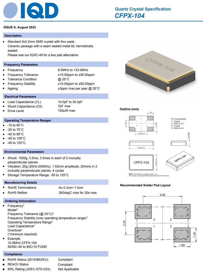 LFXTAL056583REEL | IQD晶振 | CFPX-104 | CRYSTAL 10.0000MHZ 12PF SMD | 10 MHz |