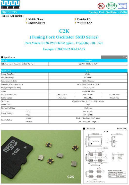 ITTI晶振,C2K有源晶振,C2KC20-32.768-15-3.3V晶振,有源晶振,是指晶體本身起振需要外部電壓供應,起振后可直接驅動CMOS集成電路,產品本身已實現與薄型IC(TSSOP封裝,TVSOP封裝)同樣的1mm厚度,斷開時的消費電流是15µA以下,編帶包裝方式可對應自動搭載及IR回流焊接(無鉛對應)產品有幾種電壓供選1.8V,2.5V,3V3.3V,5V,以應對不同IC產品需要..