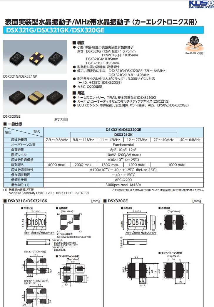KDS晶振 | 1C208000EZ0G汽車 | DSX321G | 3225 | 8.000M | 8PF | 30PPM | 40~85度 |