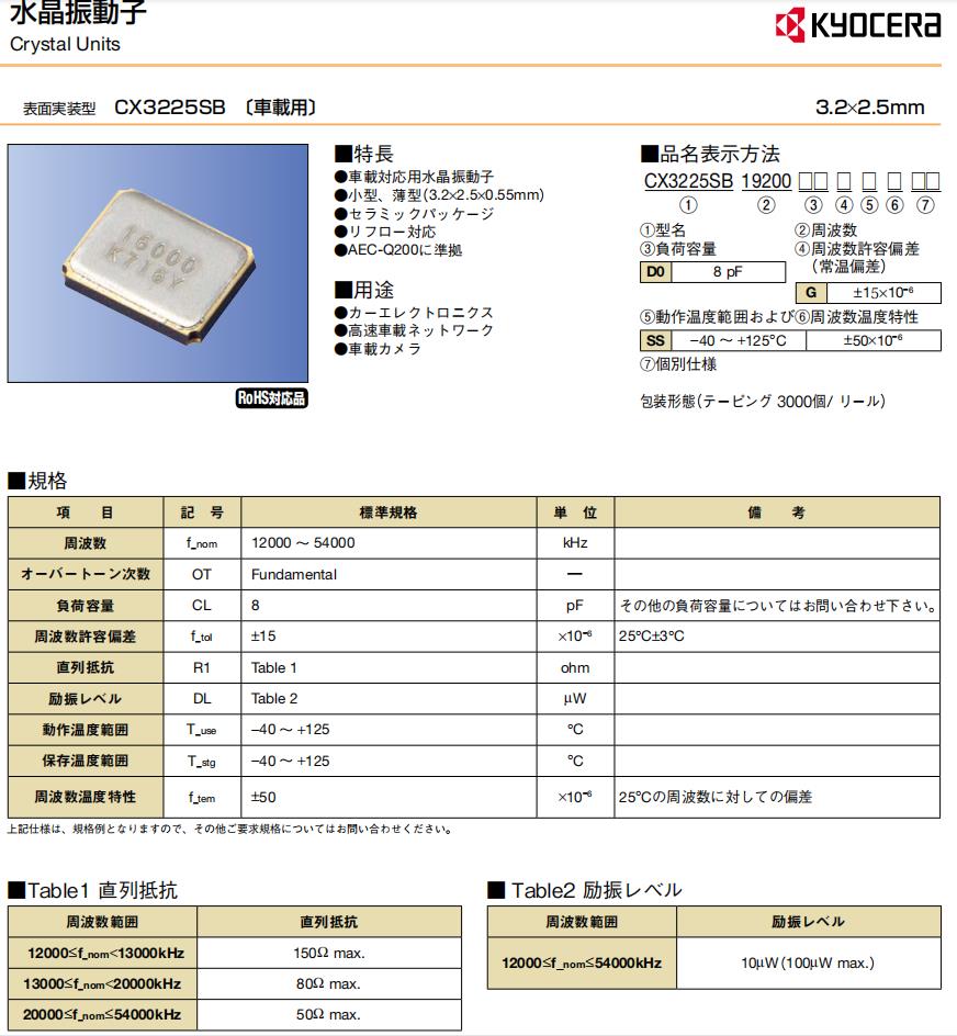 CX3225SB19200D0FLJCC | AVX Corp/Kyocera Corp | CX3225SB, Kyocera | MHz Crystal | 19.2MHz |