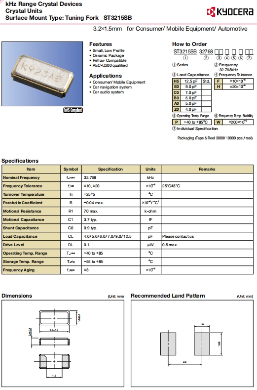 ST3215SB32768Z0HPWBB | Kyocera晶振 | ST3215SB, Kyocera | kHz Crystal (Tuning Fork) | 32.768kHz | -40°C ~ 85°C |