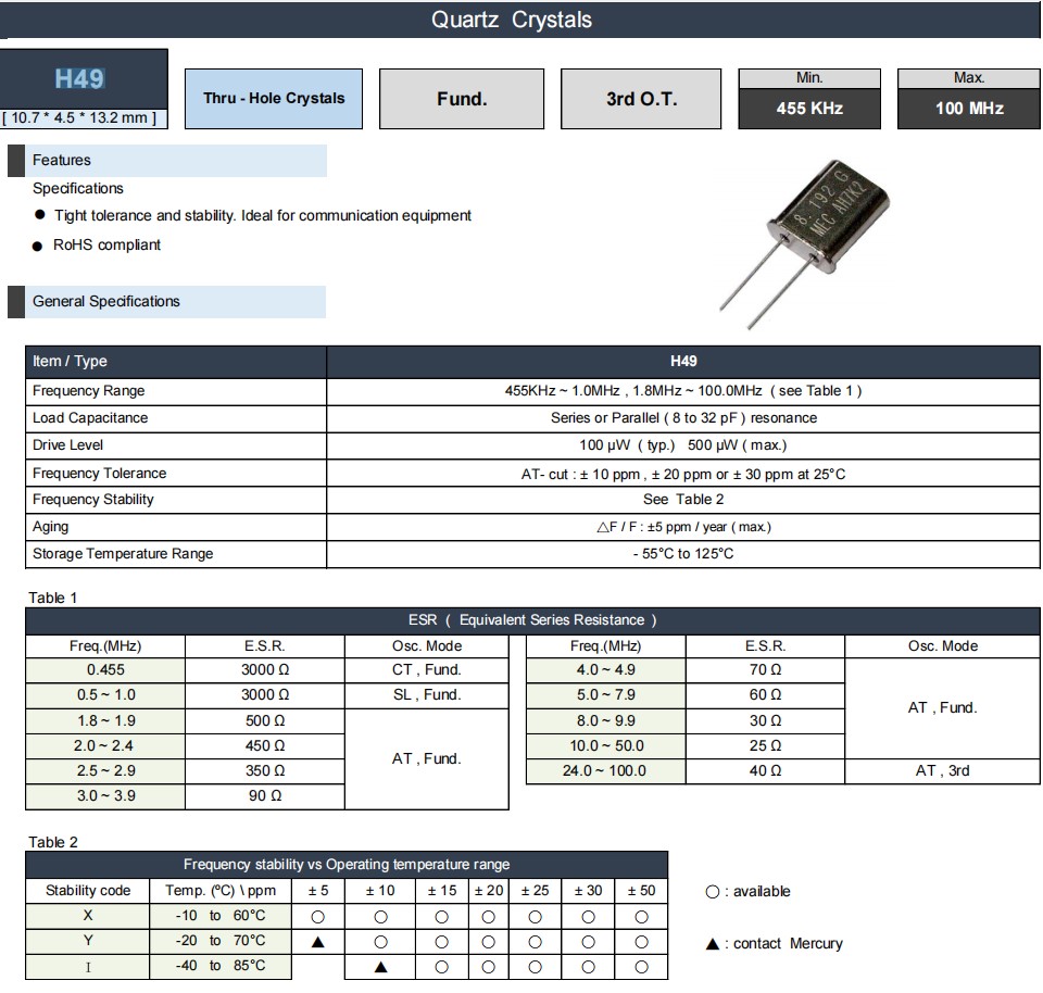 MERCURY瑪居禮晶振,H49-40.000A3-12-30/30X,高清電視6G晶振,兩腳插件晶振,無鉛環保晶振,參數表