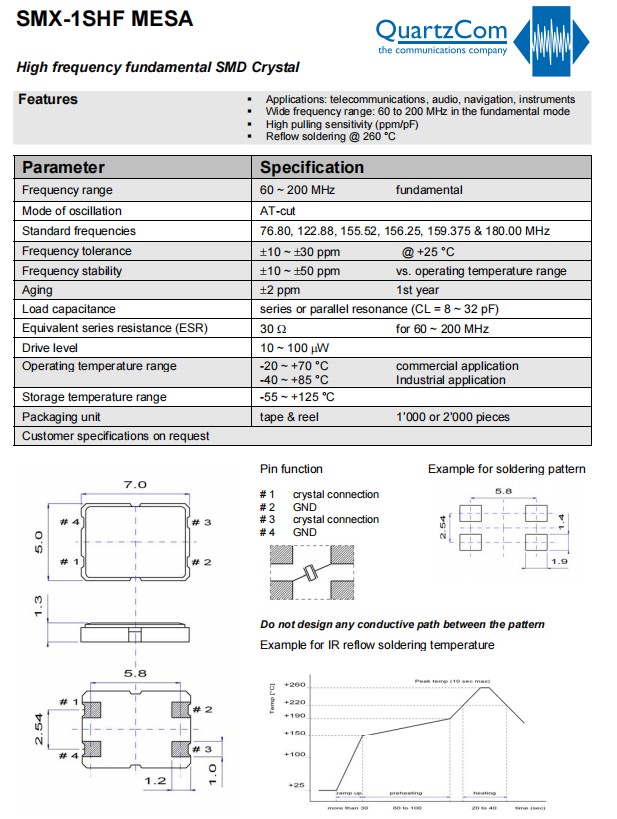 SMX-1SHF,石英通7050mm貼片晶振,儀器設備應用晶振,瑞士進口晶振,QuartzCom晶振,石英通晶振,型號:SMX-1SHF,是一款小體積晶振,尺寸:7.0x5.0mm封裝,四腳貼片晶振,無源晶振,石英晶體諧振器,7050晶振,石英晶振,高頻基線SMD晶體,無鉛環保晶振,寬頻率范圍:基本模式下為60MHz~200MHz,高牽拉靈敏度(ppm/pF),回流焊@260°C,工作溫度范圍:-20℃至+70℃商業應用,-40℃至+85℃工業應用。貼片晶振,應用于:電信晶振,音頻晶振,導航晶振,儀器設備晶振,藍牙晶振,數碼電子應晶振等。