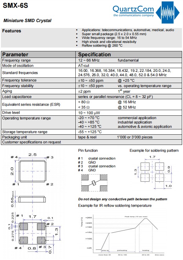 QuartzCom無源晶振,SMX-6S,2520四腳貼片晶振,音頻設(shè)備6G晶振,小體積晶振,石英晶體諧振器,瑞士進口晶振,QuartzCom石英通晶振,型號:SMX-6S,寬頻率范圍為:12MHz~66MHz,小體積晶振尺寸:2.5x2.0x0.55mm封裝,四腳貼片晶振,石英晶體諧振器,石英晶振,無源晶振,無鉛環(huán)保晶振,微型SMD晶體。貼片晶振具有超小型晶振,輕薄型晶振,高沖擊和振動電阻率,回流焊@260°C,耐熱及耐環(huán)境特點。應(yīng)用于:電信設(shè)備、汽車電子設(shè)備、醫(yī)療設(shè)備,音頻設(shè)備,可穿戴設(shè)備,小型便捷式設(shè)備,平板電腦,安防設(shè)備等應(yīng)用。