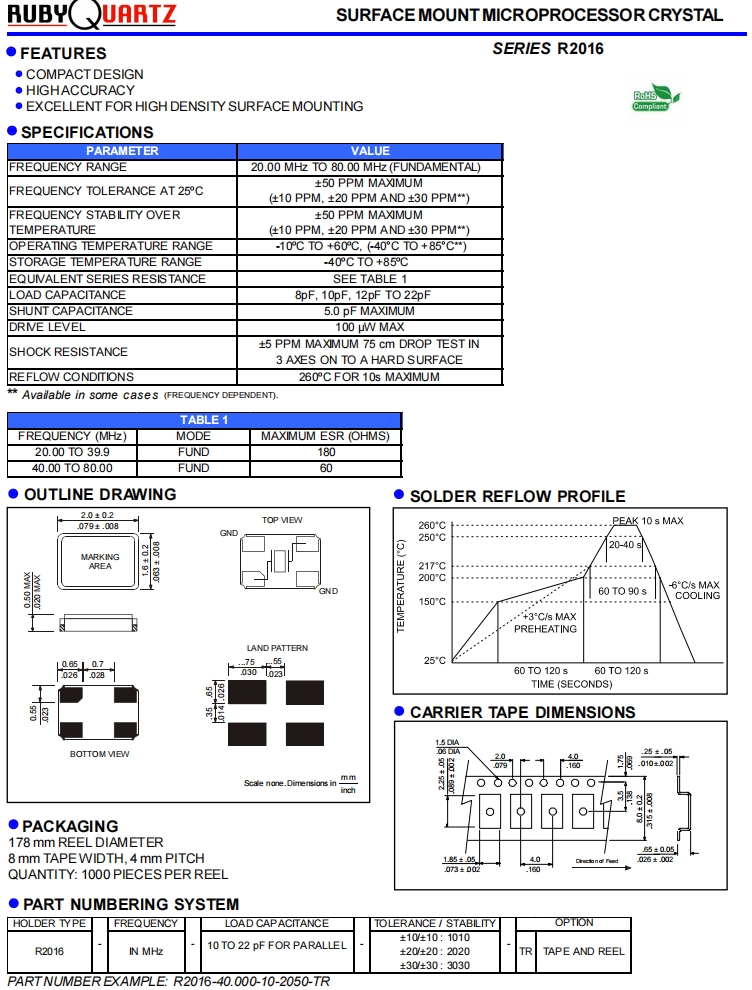 R2016-25.000-10-2020-TR,Rubyquartz高精度晶振,6G可穿戴設備晶振 參數表