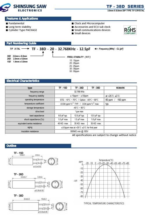 美國新松晶振,TF-38D石英插件晶振,TF-38D-15-32.768KHz-12.5pF晶振,Shinsung公司以顧客為中心,基于價值的管理,人類和諧的價值,我們認為我們的客戶是合作伙伴,并努力滿足并超越他們對質量,客戶服務和價值的要求我們是最新的Smd或通孔型貼片石英晶振單元,時鐘OSC,TCXO,VCXO,MCF等,并提供高產品 質量穩定,穩定性高。產品廣泛應用于電子行業,包括電信,微處理器,汽車,儀器儀表和醫療應用。