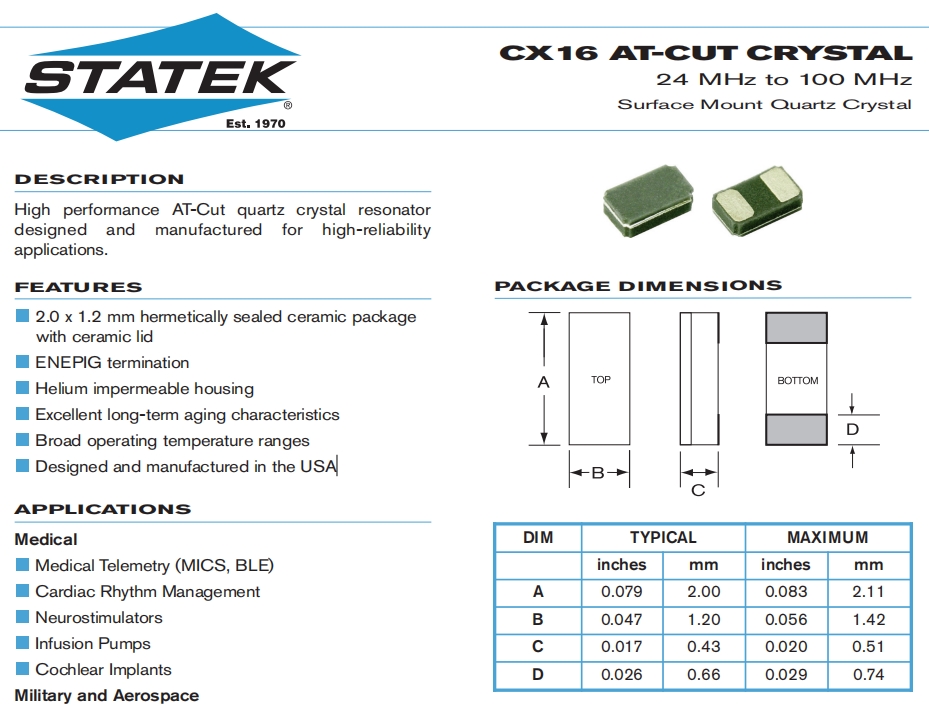 該貼片晶振器件特別適合醫(yī)療遙測(MICS,BLE),心律管理神經(jīng)刺激器,輸液泵,人工耳蝸,軍事和航空航天,航空電子指示器和儀器,駕駛艙儀表顯示器,數(shù)據(jù)通信,遙測,工業(yè)和通信,通訊,變送器,脈沖發(fā)生器,跟蹤信標(biāo),野生動物遙測等領(lǐng)域.6G通訊晶振,美國Statek斯塔克晶體,CX16SCSM1-48.0M,20/10/-/S,9pF.