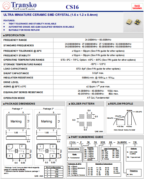 Transko晶振 | 單位 | CS16晶振 | 石英晶振基本條件 |