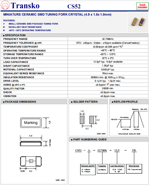 Transko晶振,CS52晶振,高品質(zhì)石英晶體,小體積SMD時(shí)鐘晶體諧振器,是貼片晶振,千赫頻率元件,應(yīng)用于時(shí)鐘模塊,智能手機(jī),全球定位系統(tǒng),因產(chǎn)品本身體積小,SMD編帶型,可應(yīng)用于高性能自動(dòng)貼片焊接,被廣泛應(yīng)用到各種小巧的便攜式消費(fèi)電子數(shù)碼時(shí)間產(chǎn)品,環(huán)保性能符合ROHS/無(wú)鉛標(biāo)準(zhǔn).