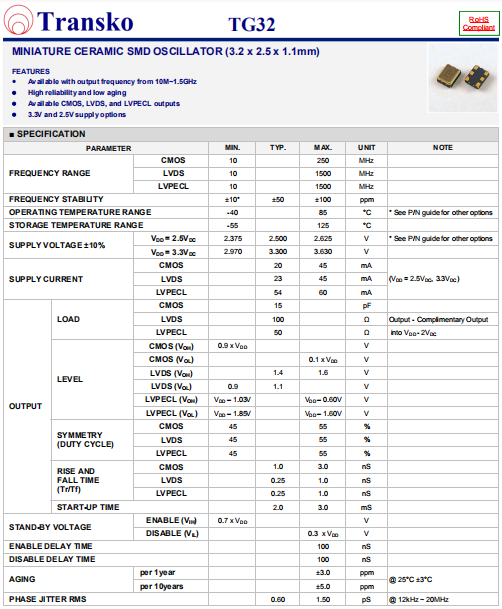 Transko晶振,TG32晶振,有源晶體振蕩器.貼片式石英晶體振蕩器,低電壓啟動功率,并且有多種電壓供選擇,比如有1.8V,2.5V,3.3V,3.8V,5V等,產品被廣泛應用于,平板筆記本,GPS系統,光纖通道,千兆以太網,串行ATA,串行連接SCSI,PCI-Express的SDH / SONET發射基站等領域.符合RoHS/無鉛.