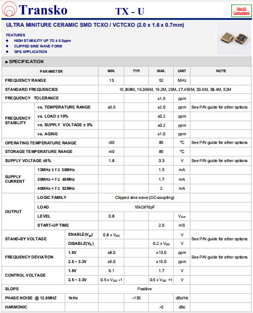 Transko晶振,TX-U晶振,溫度補償晶振.貼片晶振本身體積小,超薄型石英晶體振蕩器,特別適用于有目前高速發(fā)展的高端電子數(shù)碼產(chǎn)品,因為晶振本身小型化需求的市場領域,小型,薄型是對應陶瓷振蕩器(偏差大)和普通的石英晶體振蕩器(偏差小)的中間領域的一種性價比較出色的產(chǎn)品.產(chǎn)品廣泛用于筆記本電腦,無線電話,衛(wèi)星導航HDD, SSD, USB, Blu-ray等用途,符合無鉛焊接的高溫回流焊曲線特性.