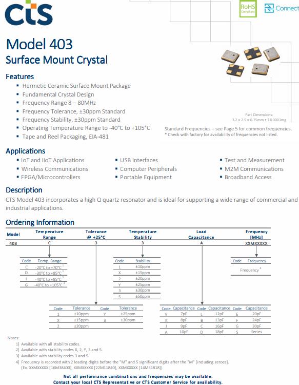 小封裝的SMD石英晶體403C35D12M00000適合于物聯網,CTS晶振應用范圍:物聯網和工業物聯網應用,無線通信,FPGA /微控制器,USB接口,電腦外圍設備,便攜式設備,測試和測量,M2M通信,寬帶接入.