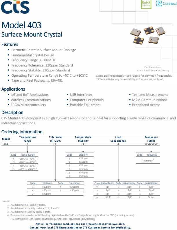 編碼403C35E27M00000,型號403,403型是一種低成本的石英晶體諧振器,廣泛用于商業應用包括WLAN/WiMax/WiFi, A/V,藍牙,ZigBee和USB接口,筆記本電腦,電腦外圍設備,便攜式設備。特征:標準3.2mm x 2.5mm焊縫封裝基本晶體設計,頻率范圍10-60MHz,頻率公差,±30ppm標準,頻率穩定性,±30ppm標準,工作溫度-40℃~ +85℃,穩定的頻率過溫和驅動電平,膠帶和卷軸包裝標準,EIA-481.
