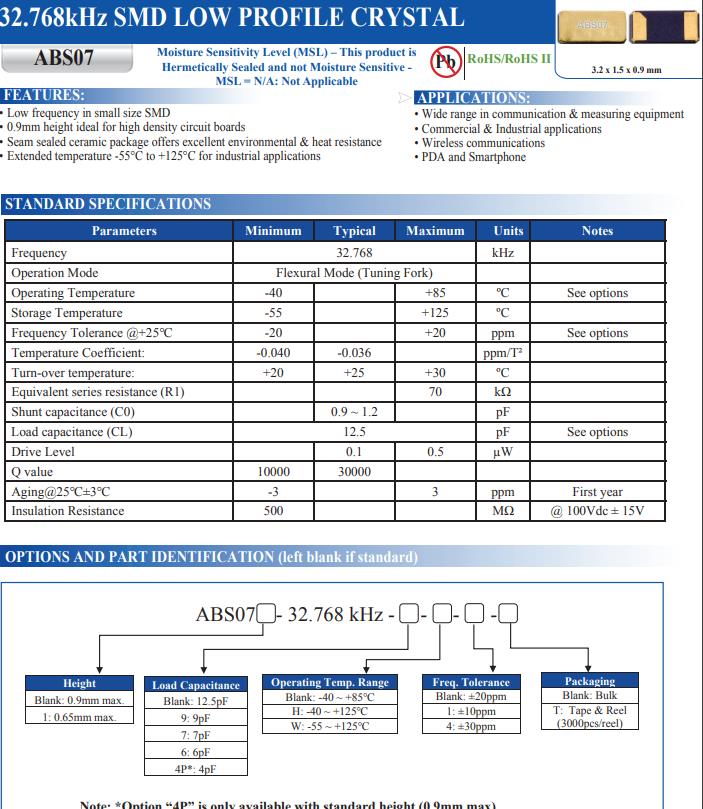 Abracon的ABS07系列,石英晶體諧振器編碼ABS07-32.768KHZ-7-1-T,小尺寸SMD的低頻率,0.9mm高度適合高密度電路板,接縫密封陶瓷包裝提供優良的環保性和耐熱性,工業應用擴展溫度-55°C至+125°C,應用:廣泛用于通信和測量設備,商業和工業應用,無線通信,PDA和智能手機