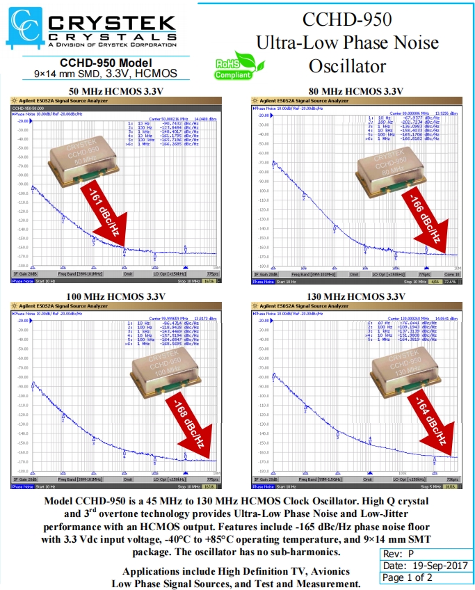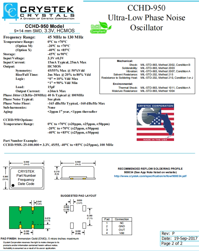 CCHD-950-50-100.000 | CRYSTEK振蕩器 | CCHD-950 | XO (Standard) | 100MHz | ±50ppm | 0°C ~ 70°C |