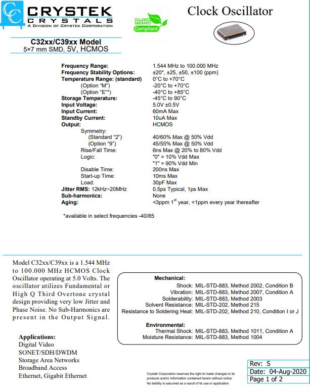 CE3291-7.372800 | CRYSTEK振蕩器 | C3291 | XO (Standard) | 7.3728MHz | ±25ppm | -40°C ~ 85°C |