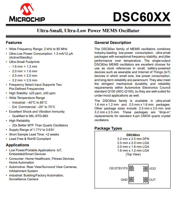 Microchip輕薄型的有源晶體振蕩器專為環(huán)繞視圖攝像頭而來DSC6001CI1A-032.0000,Microchip公司是歐美一家小有名氣的頻率元器件品牌制造商,主流的產(chǎn)品為有源晶體振蕩器,經(jīng)過長期積累,針對(duì)性開發(fā)編碼DSC6001CI1A-032.0000,DSC60xx系列MEMS振蕩器組合行業(yè)領(lǐng)先的低功耗、超小型,具有特殊頻率穩(wěn)定性和抖動(dòng)的封裝超過溫度的性能。對(duì)于這個(gè)變量DSC60xx MEMS振蕩器是理想的選擇使用時(shí)鐘參考在小型,電池供電可穿戴設(shè)備和物聯(lián)網(wǎng)(IoT)等設(shè)備器件體積小,功耗低,長期的可靠性是最重要的。他們也會(huì)遵從嚴(yán)格的機(jī)械耐久性和可靠性,汽車電子委員會(huì)的要求標(biāo)準(zhǔn)Q100 (AEC-Q100),因此它們非常適合引擎蓋下的應(yīng)用也是如此。DSC60xx系列提供超小型1.6mm×1.2mm和2.0mm×1.6mm封裝。其他包裝尺寸包括:2.5毫米× 2.0毫米和3.2mm×2.5mm。這些包裹是“臨時(shí)提供的”。標(biāo)準(zhǔn)4針CMOS石英晶體的替代品振蕩器。